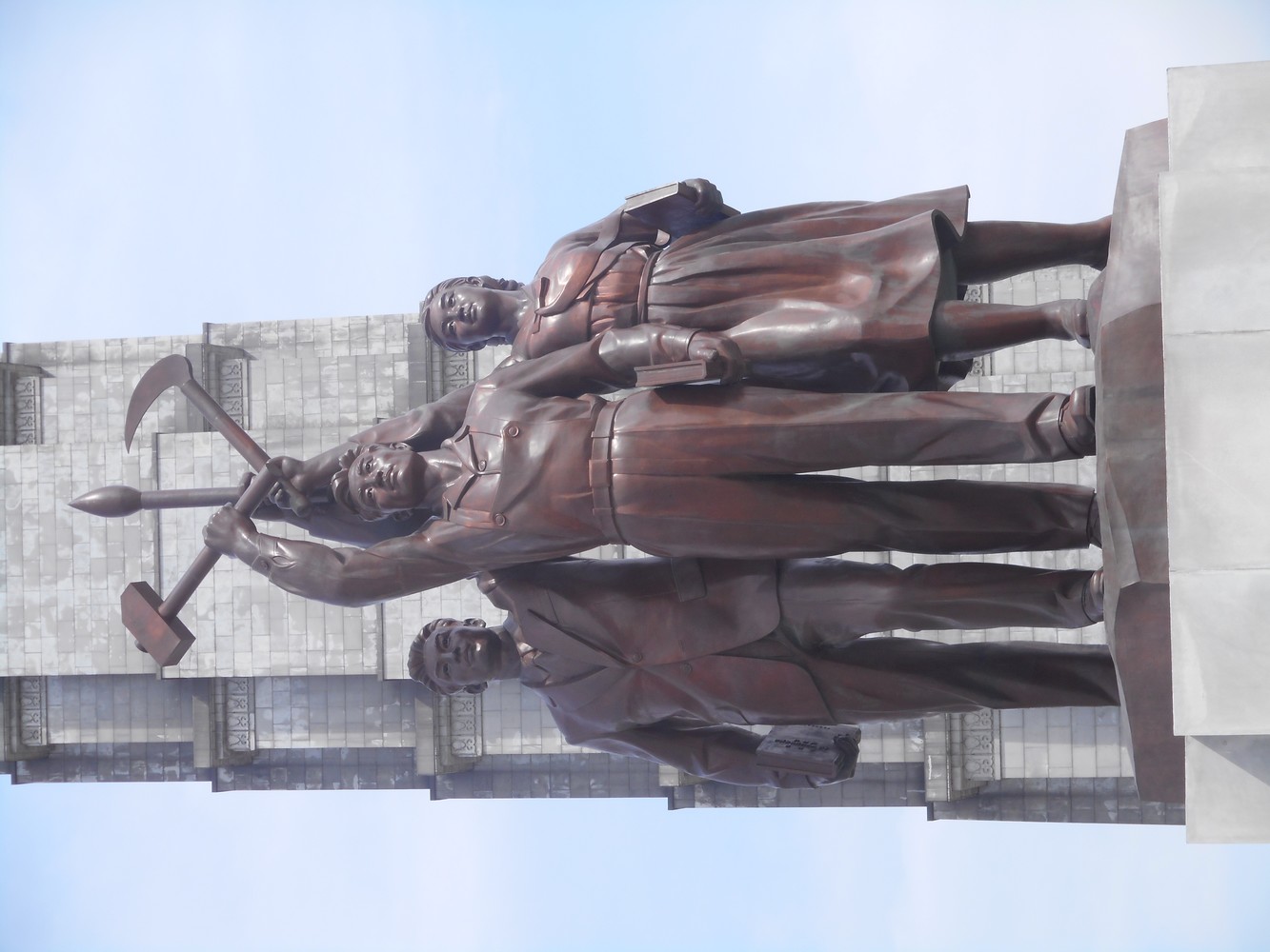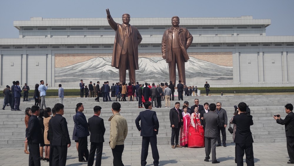Po návštěvě expozice se delegáti poklonili před bronzovými sochami velkých vůdců, jež jsou součástí památníku na vrchu Mansude před Muzeem korejské revoluce. Sochy velkého vůdce a velkého generála jsou doplněny dvěma mohutnými sousošími seskupenými kolem rudých praporů. Jedno z nich znázorňuje boj za osvobození od japonské okupace, druhé budování a obranu socialismu. K památníku neustále proudí zástupy korejských soudruhů a soudružek (v lidové Koreji se tak titulují všichni občané včetně dětí), aby uctili památku otců národa. Mezi nimi je velký počet novomanželů s rodinami a svatebními hosty, ženy v nádherných mohutných pestrobarevných šatech čoson-ot. (Manželství má v KLDR velký význam, ve věku od třicátníků výše žijí v manželství téměř všichni občané a rozvodů je naprosto nepatrné množství. Není přípustná prostituce, pornografie ani sexuální úchylky.)