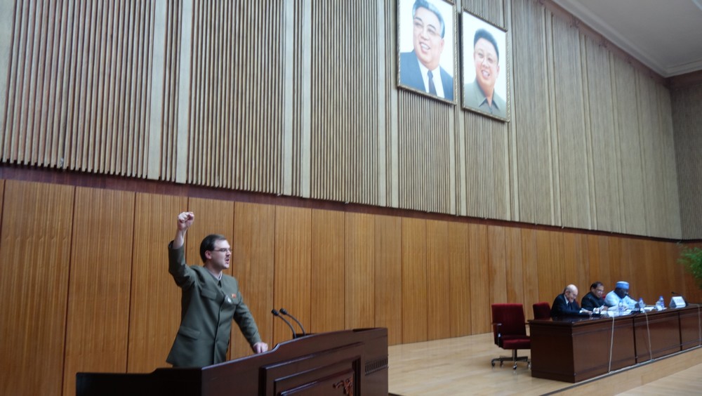 Korejští řečníci vyzvedli ve svých projevech šťastný a nezávislý život lidu socialistické Koreje, která se z utlačované země stala mocnou socialistickou zemí, nezávislým státem důstojného lidu, spoléhá na vlastní vědu a techniku a s hrdostí a sebedůvěrou provádí nový pochod ekonomické obnovy s veškerým úsilím pro nezávislost, proti imperialismu a podřízenosti.