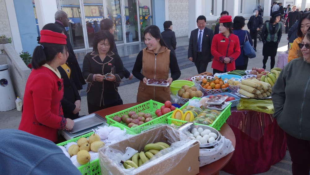 Prodej potravin na odpočívadle dálnice z Pchjongjangu do Hjangsanu