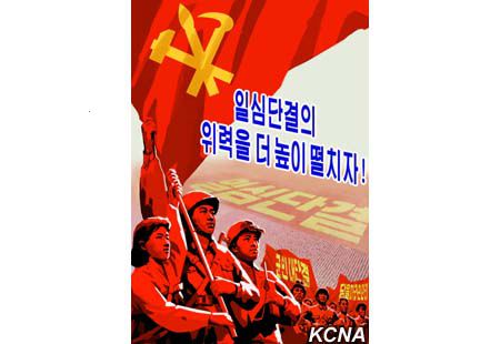 Plakát s titulem „Dávejme na odiv moc cílevědomé jednoty!“ zobrazuje lid KLDR pozvedající vlajku strany orientované v duchu čučche v dynamickém postupu vpřed k čestnému měsíci květnu, na pozadí obrazu zobrazující lid cílevědomě sjednocený kolem strany a vůdce.
