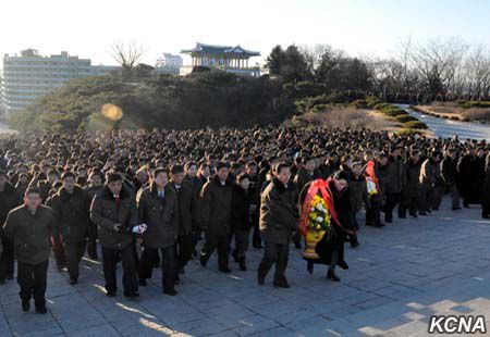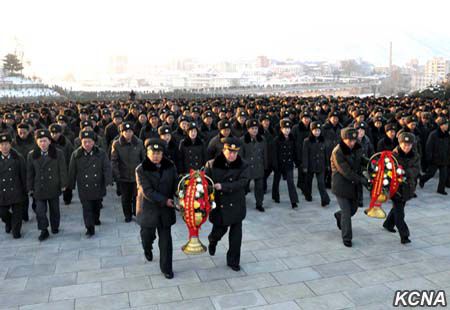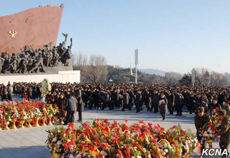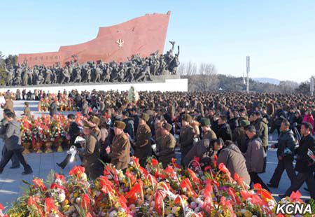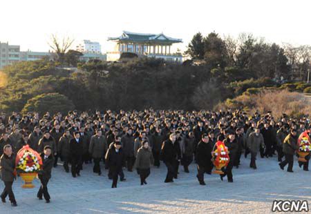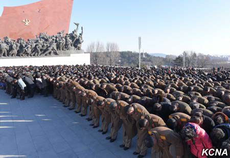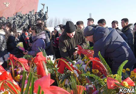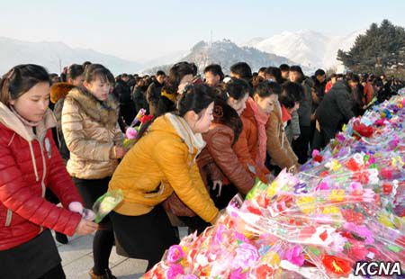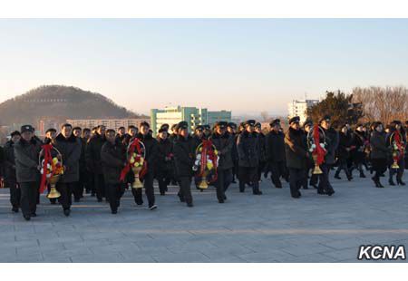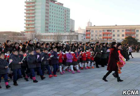 Pchjongjang, 17. prosince 2015 17:32 KST (KCNA) – Vojáci, lidé ze všech oblastí života a školní mládež a děti navštívili sochy prezidenta Kim Ir Sena (Kim Il Sunga) a vůdce Kim Čong Ila a portréty usměvavých velkých vůdců v různých částech země u příležitosti čtvrtého výročí Kim Čong Ilova skonu.