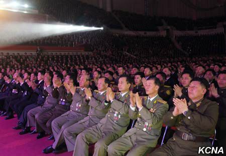 Účinkující vysoce ocenili nejvyššího vůdce Kim Čong Una, který dosahuje vítězství překvapujících celý svět, jako jedinečného hrdinu, stále vítězný prapor nepřemožitelně velkého národa.