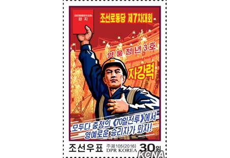 Pchjongjang, 23. března čučche 105 (2016) (KCNA) – Státní známkový výbor KLDR vydal jednotlivé známky dvou druhů, odrážející ducha současné doby pulzující náporem k oslavě sedmého sjezdu Korejské strany práce největším rozkvětem revoluce.
