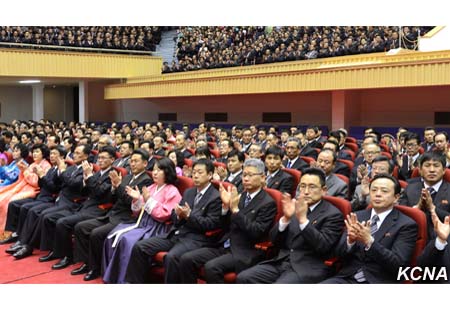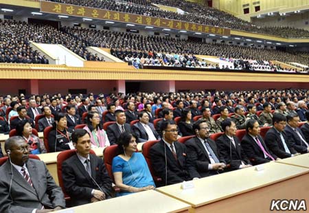 Přítomni byli Kim Jong Nam, Hwang Pjong So, Pak Pong Ču a další vedoucí funkcionáři strany, státu a armády, předsedové spřátelených stran, členové orgánu ústředního vedení strany v Pchjongjangu, funkcionáři strany a orgánů ozbrojených sil, ministerstev a státních institucí, vojáci Korejské lidové armády a Korejských lidových vnitřních bezpečnostních sil, zástupci institucí a průmyslových podniků ve městě, lidé spojení s revoluční činností velkých vůdců, ti, kteří měli tu čest být přijati velkými vůdci, pozůstalí rodin revolučních mučedníků, pracující lidé, delegace zámořských Korejců, Korejci ze zámoří a náčelník pchjongjangské mise Antiimperialistického národní demokratické fronty.