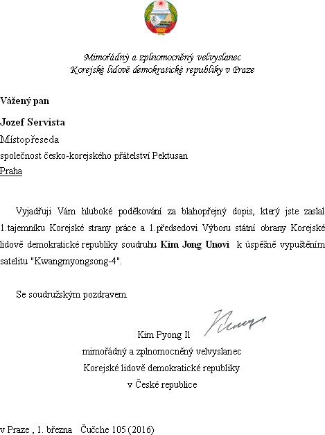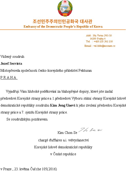 Společnost česko-korejského přátelství Pektusan obdržela děkovné dopisy od velvyslanectví Korejské lidově demokratické republiky, které zveřejňujeme níže.