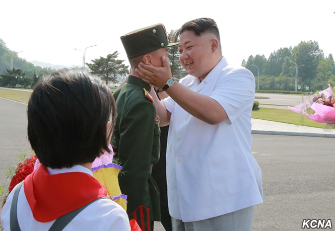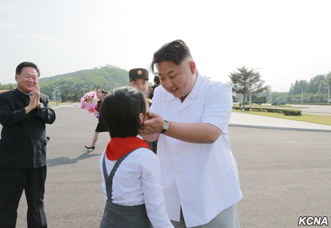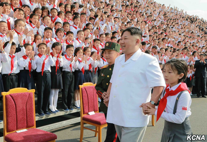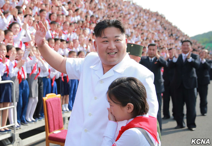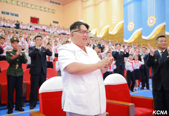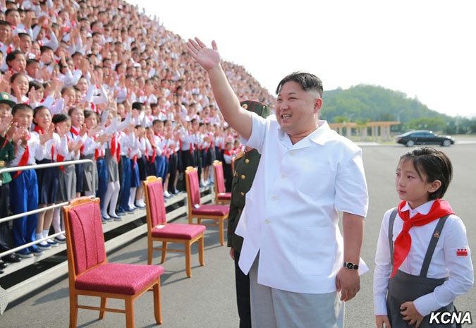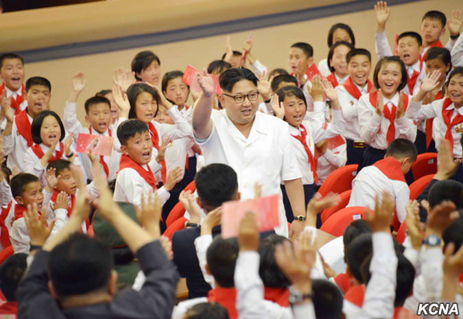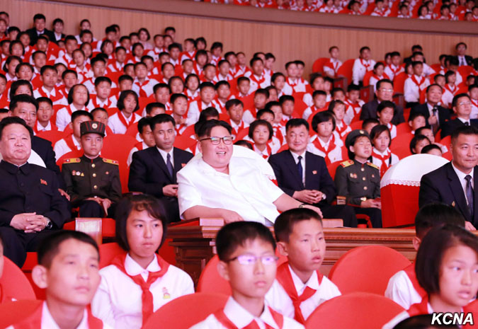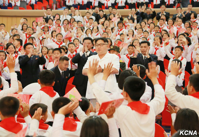 Kim Čong Un poblahopřál školákům k jejich úspěšnému vystoupení a vřele kvitoval nadšeně jásající publikum.