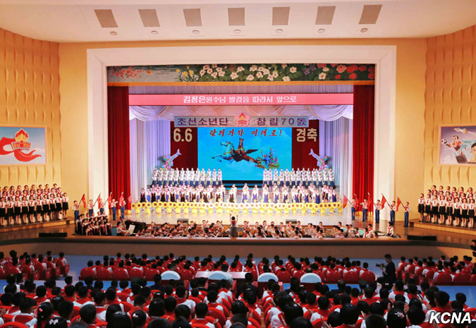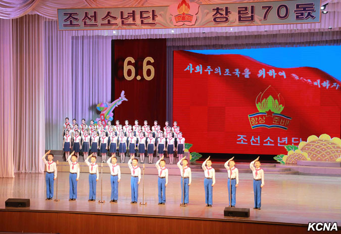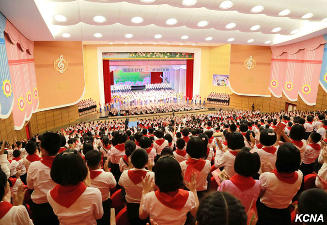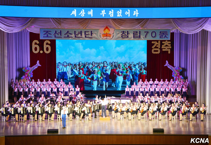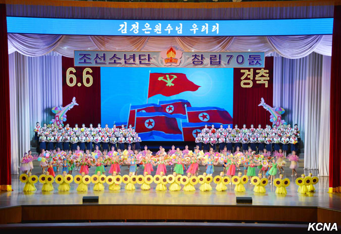 Pchjongjang, 8. června čučche 105 (2016) (KCNA) – „Jsme nejšťastnější na světě“, vystoupení školáků na oslavu 70. výročí založení Korejského svazu dětí (KSD), se v úterý slavnostně konalo v Paláci školáků Mangjongde. Kim Čong Un, předseda Korejské strany práce, první předseda Komise národní obrany KLDR a vrchní velitel Korejské lidové armády, sledoval představení spolu s delegáty k oslavám 70. výročí založení KSD.