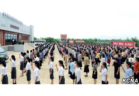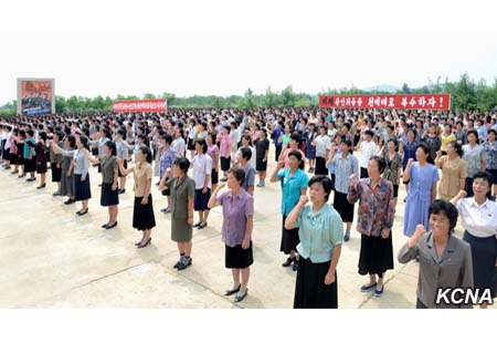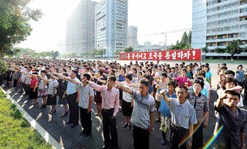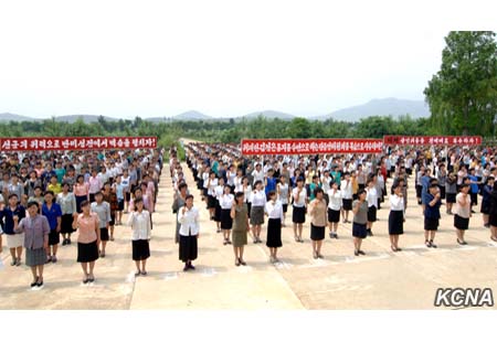 Účastníci skandovali hesla, která odrážejí pevnou vůli oddaně hájit stranu a vůdce a přinutit nepřátele zaplatit tisícinásobnou cenou za prolitou krev korejského lidu.
