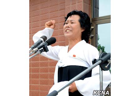 Kim Mjong Gum, která byl svědkyní zločinů spáchaných imperialisty USA, pronesla řeč.
