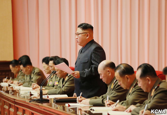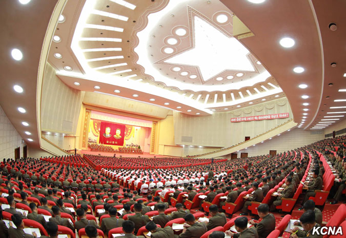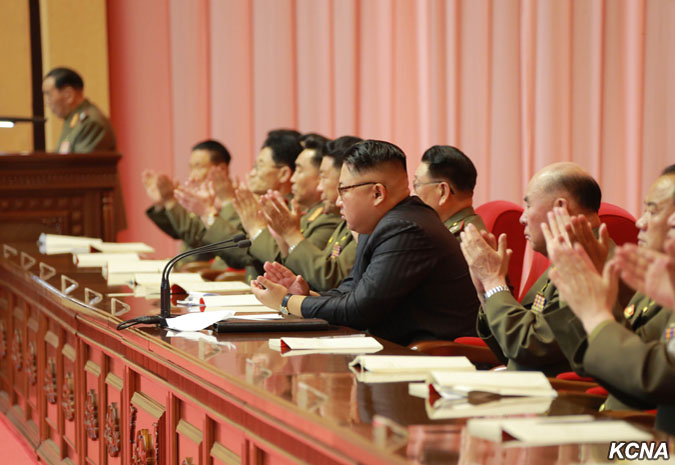 Vicemaršál KLA Hwang Pjong So, ředitel Generálního politického byra KLA, přednesl na schůzi zprávu.