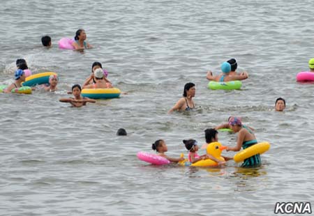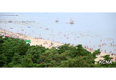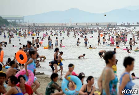 Pchjongjang, 9. srpna čučche 105 (2016) (KCNA) – Pláž Songdowon ve městě Wonsan v KLDR je v těchto dnech přeplněna mnoha občany, včetně školáků.