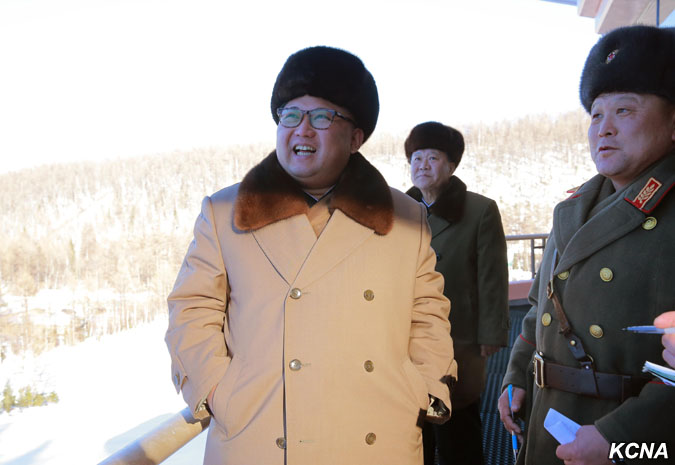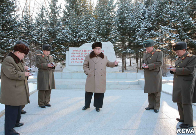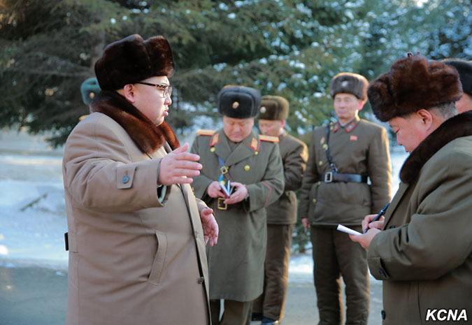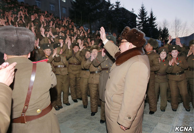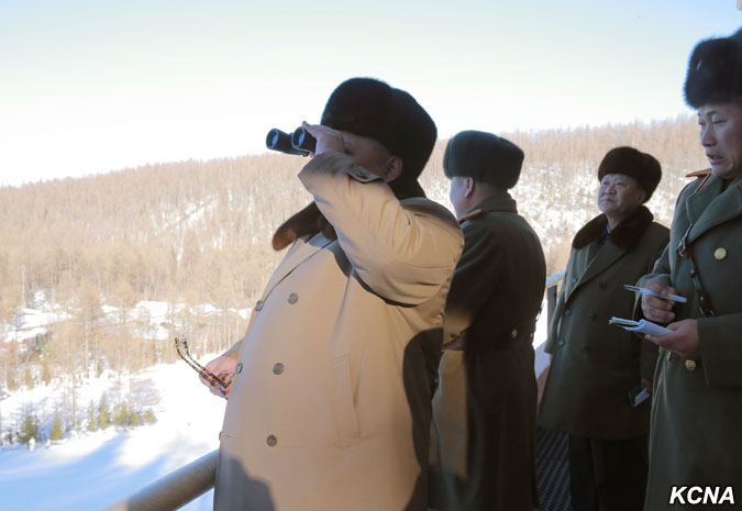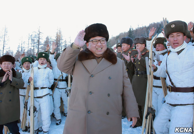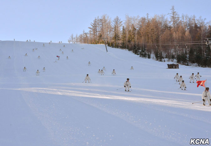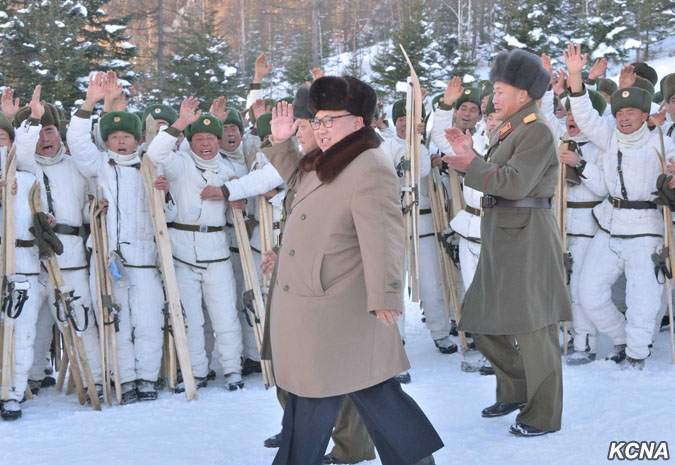 Sleduje vojáky sjíždějící ze svahu jako vítr, zatímco obdivuhodně provádějí různé obtížné bojové činnosti, Kim Čong Un je vysoce ocenil za jejich úspěšné vzdělávání.