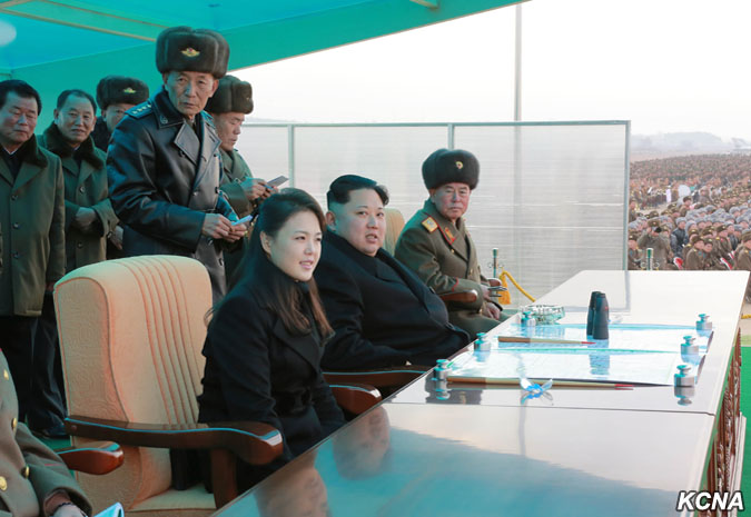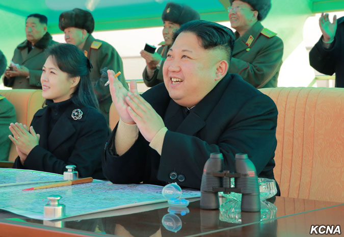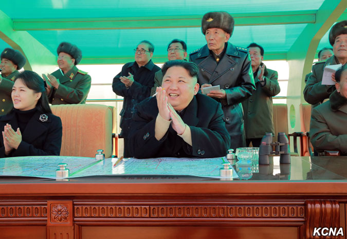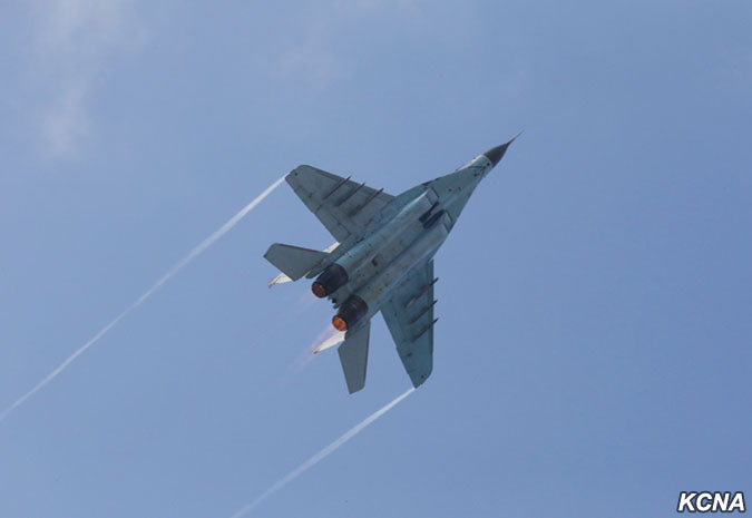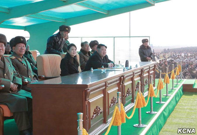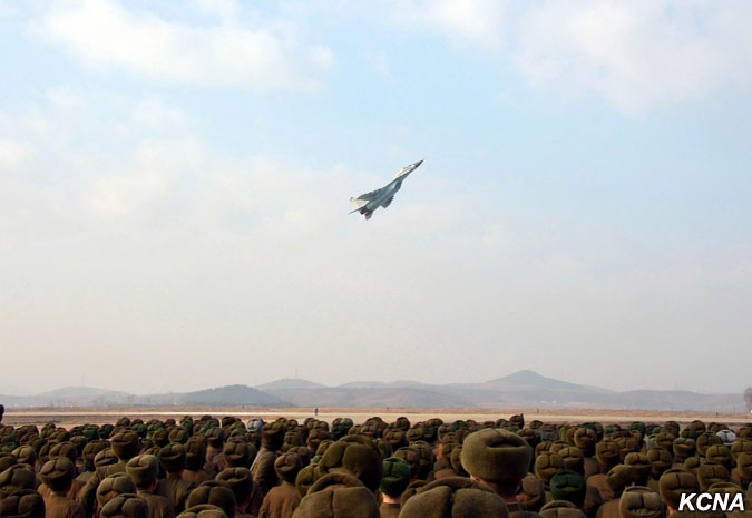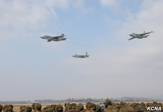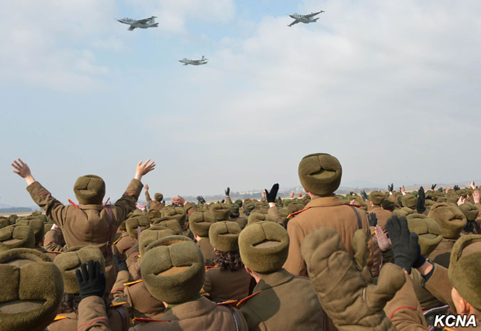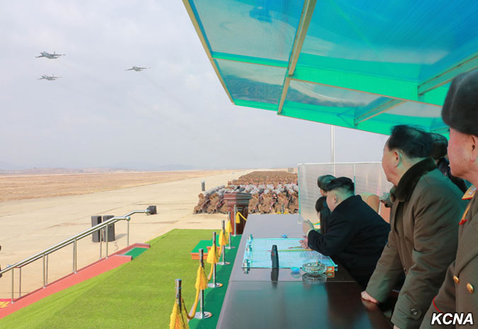 Kim Čong Un vydal rozkaz k bojovému letu velitelům a pilotům, kteří se postavili na plošinu před pozorovatelnou.