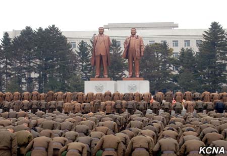 Kim Čong Un spolu s účastníky vzdal vysoký hold sochám.