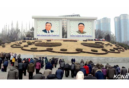 Velitel čestné stráže pozemních, námořních, leteckých a protivzdušných sil Korejské lidové armády a Dělnicko-rolnických rudých gard zasalutoval směrem k sochám.Květinový koš ve jménu Kim Čong Una byl umístěn před sochy. Také byly položeny květinové koše ve společném jménu Ústředního výboru a Ústřední vojenské komise KSP, Komise pro státní záležitosti KLDR, prezídia Nejvyššího lidového shromáždění a vlády KLDR.