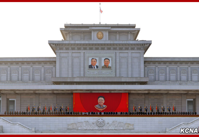 Kim Čong Un, předseda Korejské strany práce, předseda Komise pro státní záležitosti KLDR a vrchní velitel Korejské lidové armády, stanul na čestné tribuně vzpomínkového shromáždění.