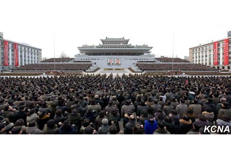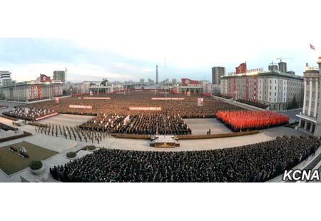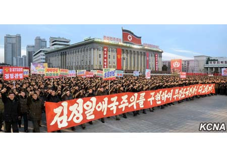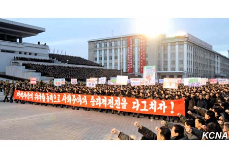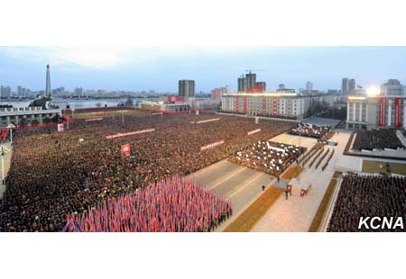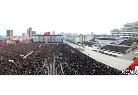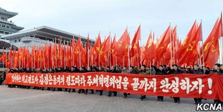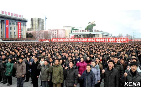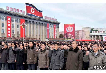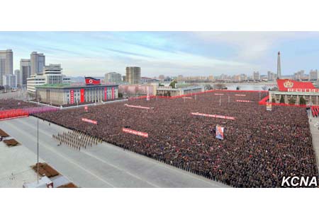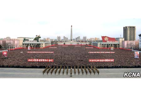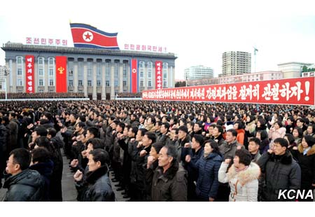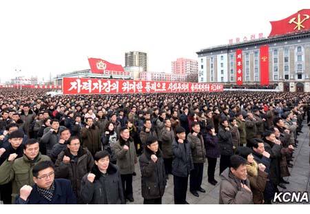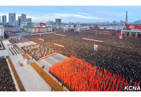 Pchjongjang, 5. ledna čučche 106 (2017) (KCNA) – Pchjongjangská městská masová manifestace se konala na Kim Ir Senově (Kim Il Sungově) náměstí ve čtvrtek, aby slíbila prosadit plnění úkolů stanovených váženým nejvyšším vůdcem Kim Čong Unem v jeho novoročním projevu.