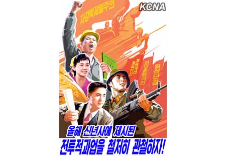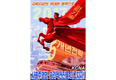 Pchjongjang, 7. ledna čučche 106 (2017) (KCNA) – V KLDR byly vyrobeny plakáty, aby podporovaly armádu a lid v boji za plnění úkolů, stanovených váženým nejvyšším vůdcem Kim Čong Unem v jeho novoročním projevu.