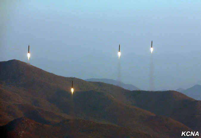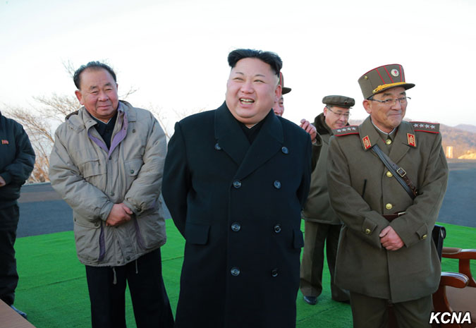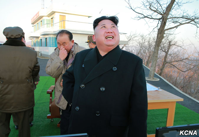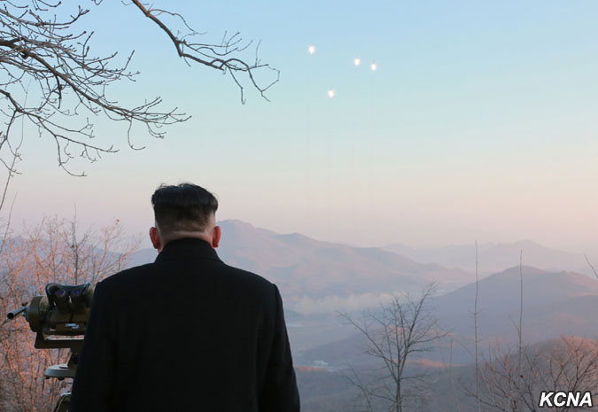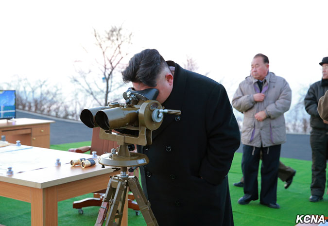 Pchjongjang, 7. března čučche 106 (2017) (KCNA) – Kim Čong Un, předseda Korejské strany práce, předseda Komise pro státní záležitosti KLDR a vrchní velitel Korejské lidové armády (KLA), na místě dohlížel na cvičné odpálení balistických raket hwasongských dělostřeleckých jednotek strategických sil KLA.