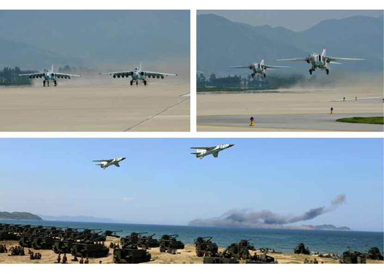 Ponorky sa rýchlo ponorili, aby vykonali torpédové útoky na „nepriateľské“ vojnové lode, zatiaľ čo stíhačky a bombardéry vzlietli nad more, aby zhodili bomby na ciele. Pri pohľade na vzrušujúcu scenériu chválil posádku ponoriek a pilotov, ktorí zakaždým zasiahli ciele.