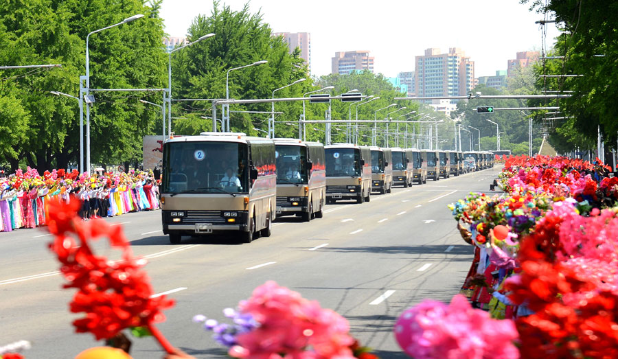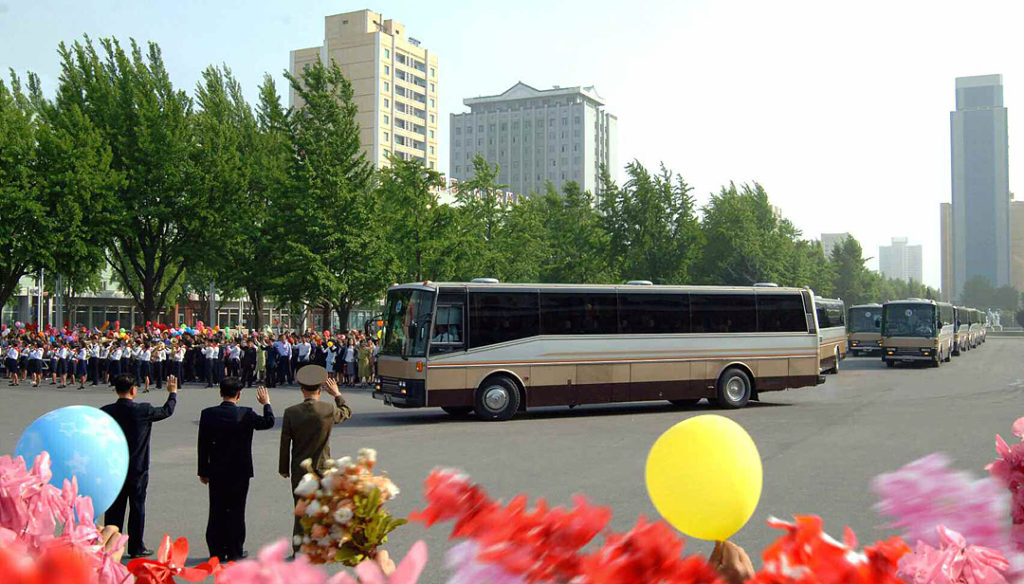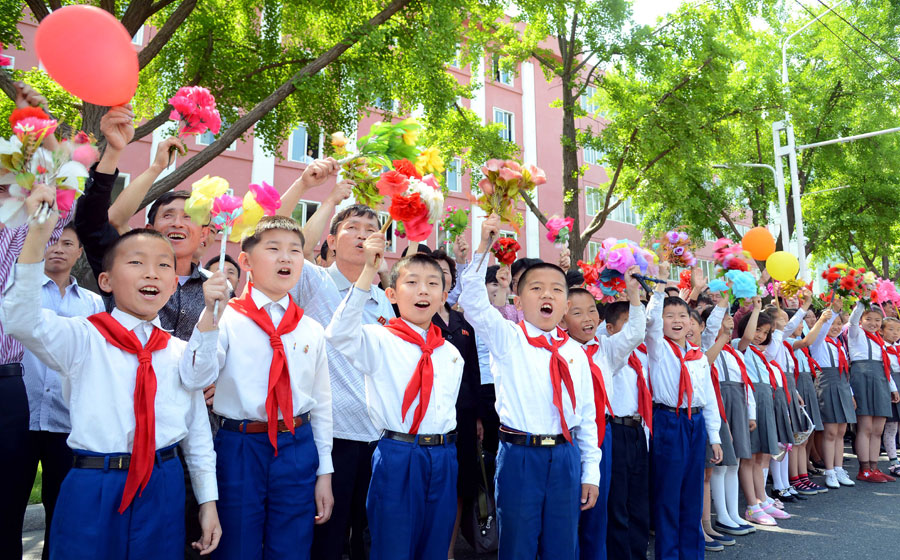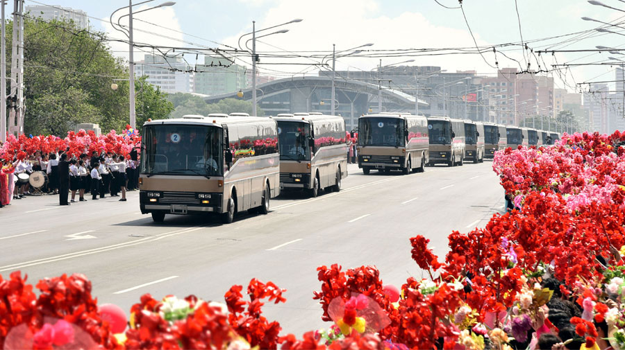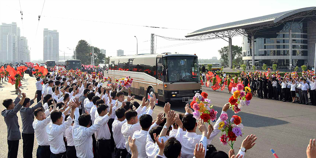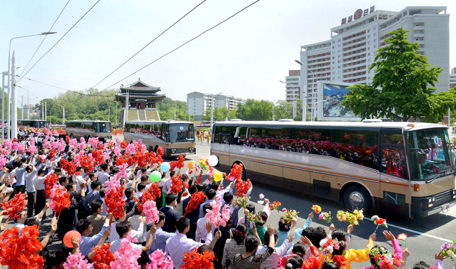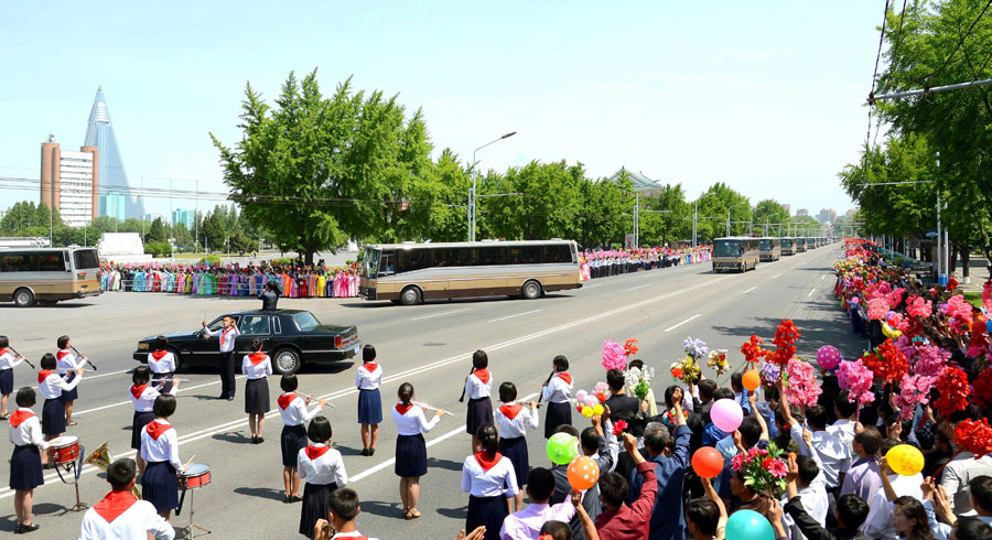Občania im srdečne blahoželali, mávali vlajkami KĽDR, červenými vlajkami a kyticami.