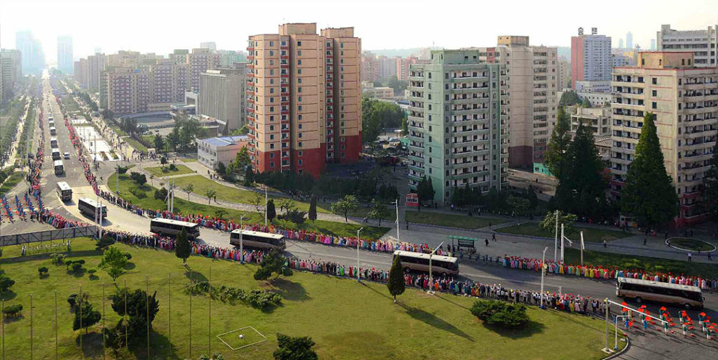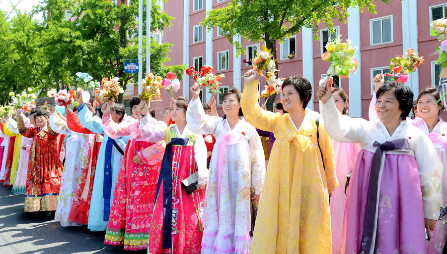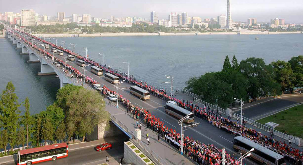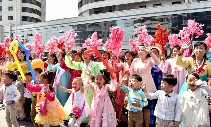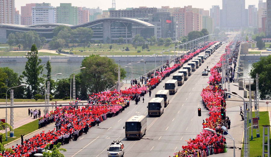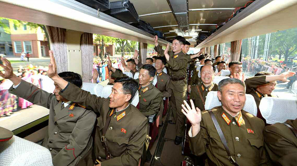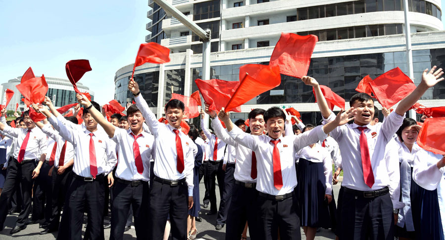 Občania im srdečne blahoželali, mávali vlajkami KĽDR, červenými vlajkami a kyticami.