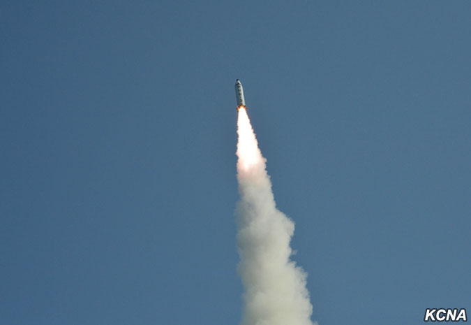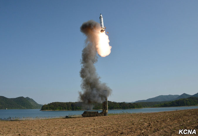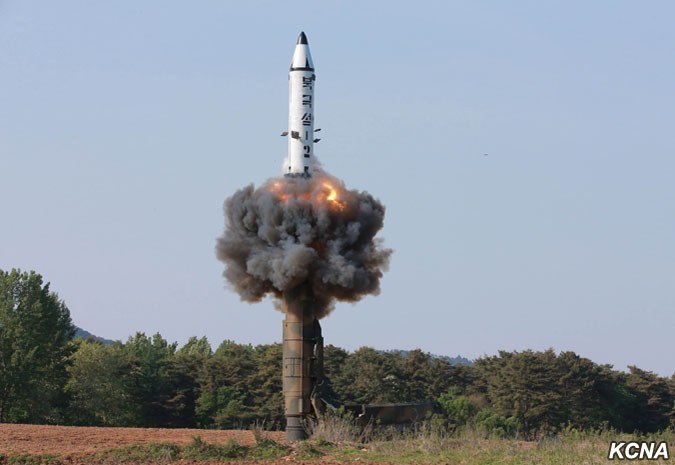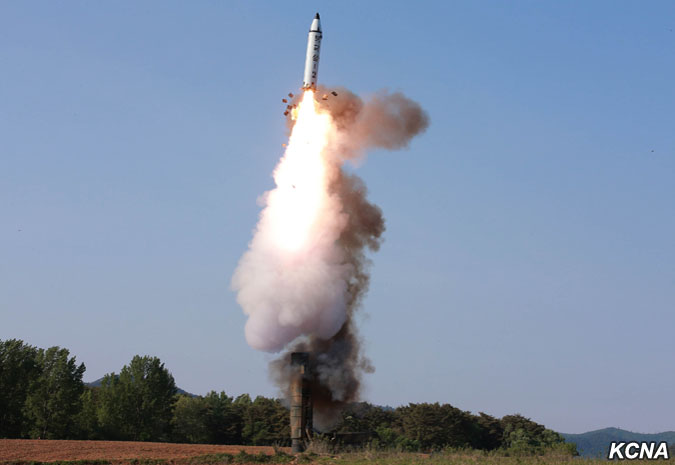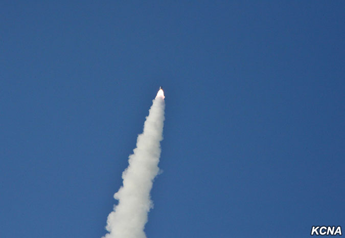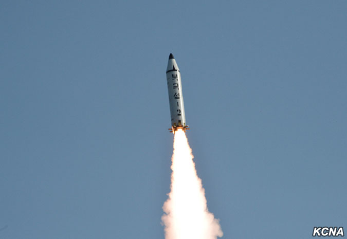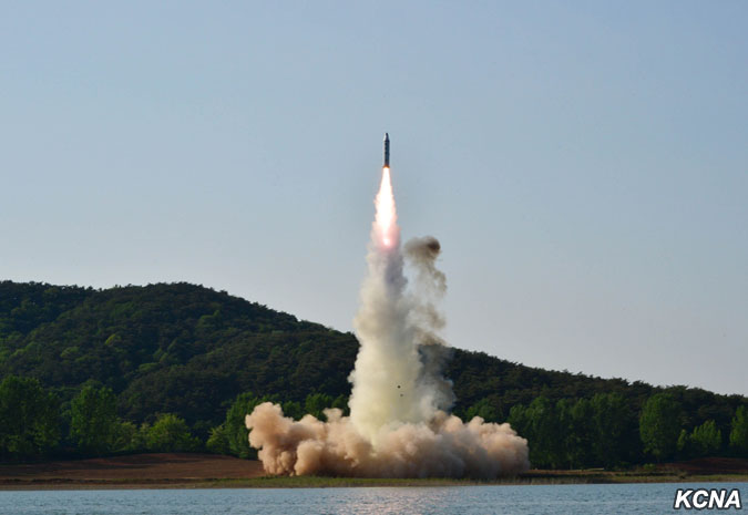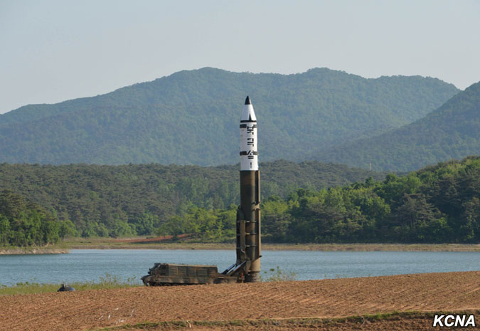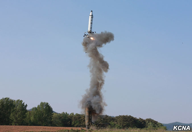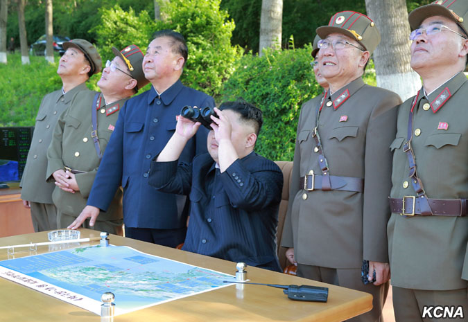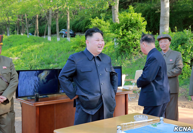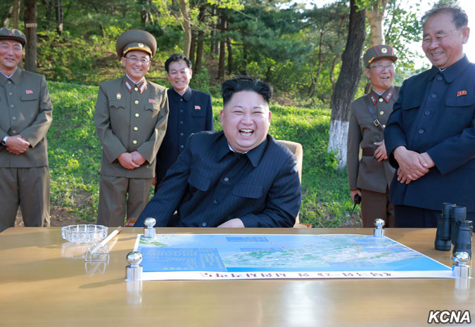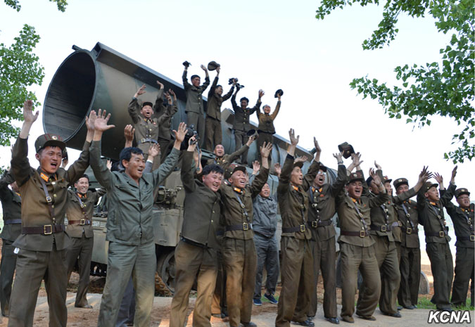 Pchjongjang, 22. května čučche 106 (2017) (KCNA) – Vážený nejvyšší vůdce soudruh Kim Čong Un, předseda Korejské strany práce (KSP), předseda Komise pro státní záležitosti KLDR a vrchní velitel Korejské lidové armády, dohlížel na zkušební střelbu strategické balistické rakety Pukguksong-2 středního až dlouhého doletu země-země.