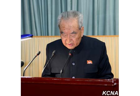 Súdruh Kim Ki Nam, člen politického byra ÚV Kórejskej strany práce, člen Komisie pre štátne záležitosti KĽDR a podpredseda ÚV KSP, predniesol prejav: