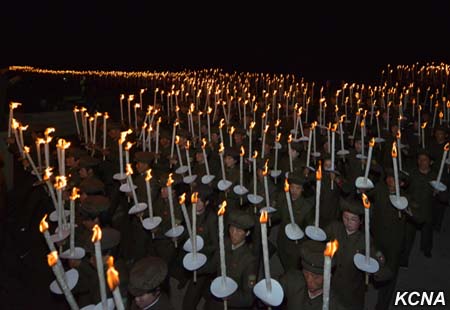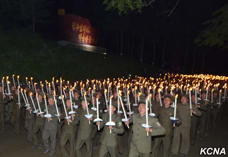 S piesňou „Nech žije generalissimus Kim Ir Sen“ sa účastníci vybrali na Počchonbo s pochodňami v rukách. Púšťanie piesne „Guerrillový pochod“ (Partizánsky pochod, pozn. prekl.) ich veľmi povzbudilo pri prechode cez hlavné bitevné miesta, ako boli napríklad policajná stanica a obvodný úrad.