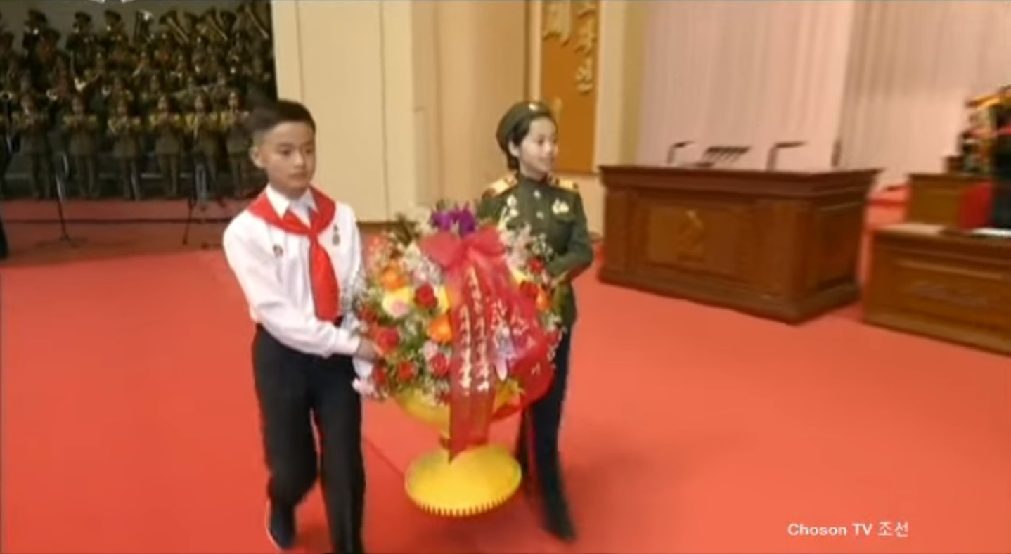 Vážený maršál Kim Čong Un se dostavil na čestnou tribunu sjezdového sálu společně s delegáty. Členka KSD mu uvázala kolem krku rudý šátek. Delegáti KSD mu předali květinový koš. Blahopřál delegátům, nadšeně provolávajícím slávu, a předal jim vřelé pozdravy.