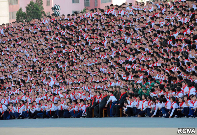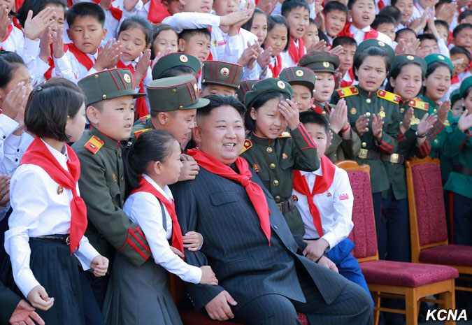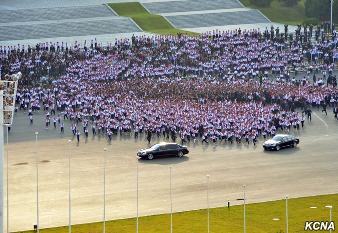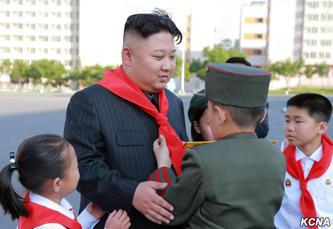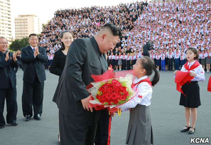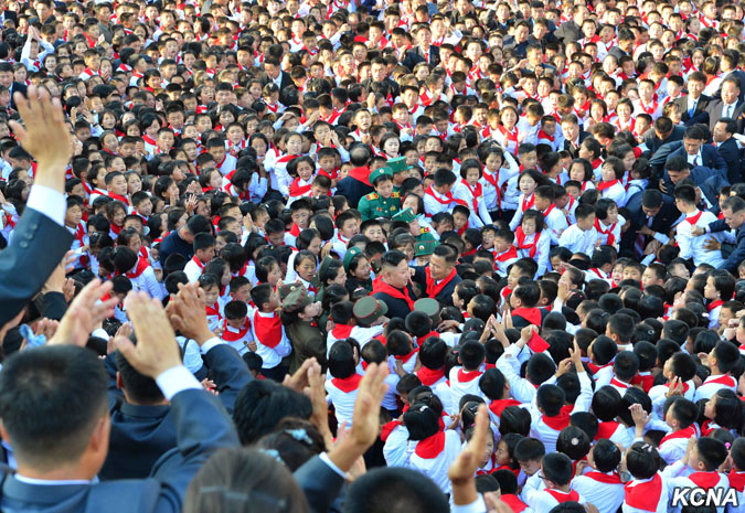 Když maršál Kim Čong Un dorazil na místo konání fotografického setkání, delegáti KSD mu předali voňavou kytici a uvázali kolem krku rudý šátek.
