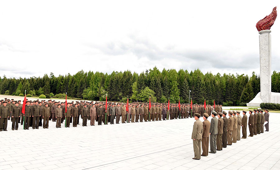 Pchjongjang, 11. června čučche 106 (2017) – Informační pracovníci strany, kteří uskutečnili studijní cestu na revoluční bitevní místa v oblasti hory Pektu, uspořádali 11. června slavnostní shromáždění před sochou velkého vůdce soudruha Kim Ir Sena (Kim Il Sunga) před Samčijonským velkým památníkem.