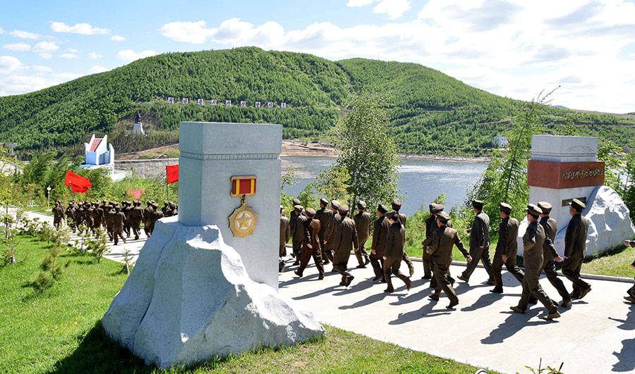 Pchjongjang, 11. června čučche 106 (2017) – Informační pracovníci strany, kteří uskutečnili studijní cestu na revoluční bitevní místa v oblasti hory Pektu, uspořádali 11. června slavnostní shromáždění před sochou velkého vůdce soudruha Kim Ir Sena (Kim Il Sunga) před Samčijonským velkým památníkem.