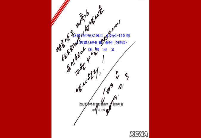 Vedci a technici z Vedeckej akadémie obrany KĽDR úspešne vykonali skúšobný odpal medzikontinentálnej balistickej rakety Hwasong-14, ktorá bola u nich vyvinutá a zmodernizovaná pod strategickým rozhodnutím Kim Čong Una, predsedu Kórejskej strany práce, predsedu Komisie pre štátne záležitosti KĽDR a vrchného veliteľa Kórejskej ľudovej armády.