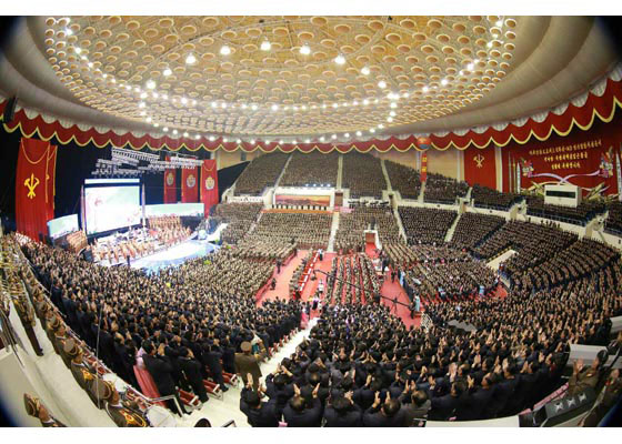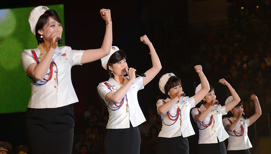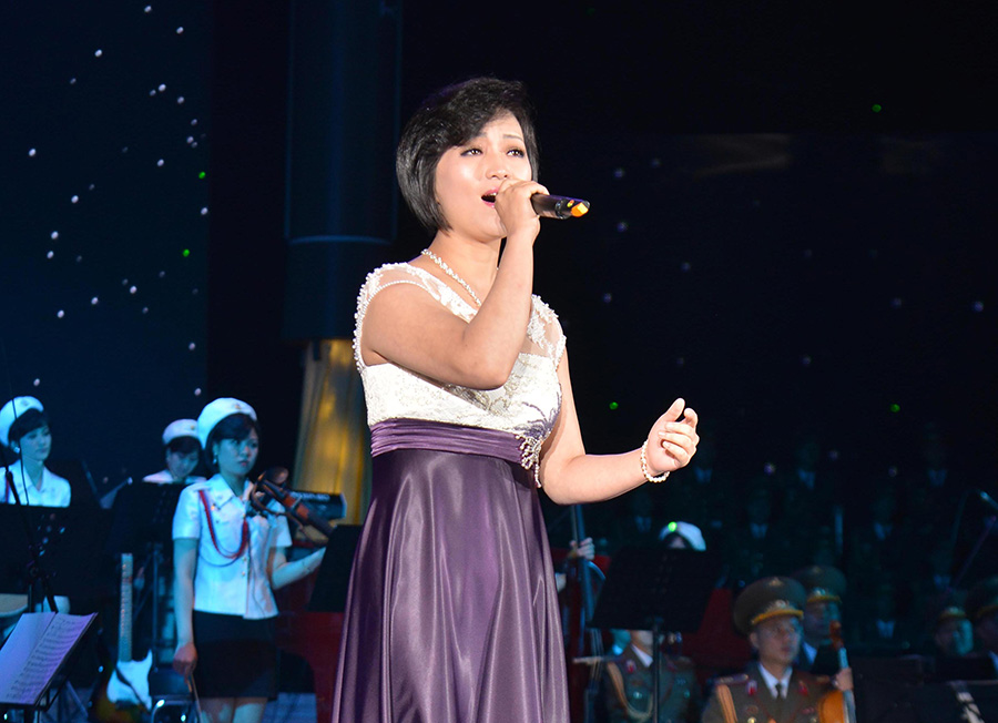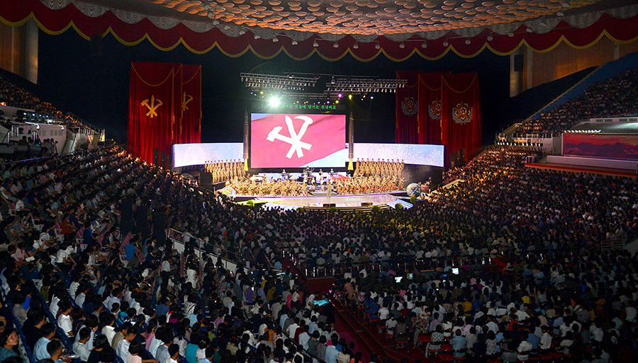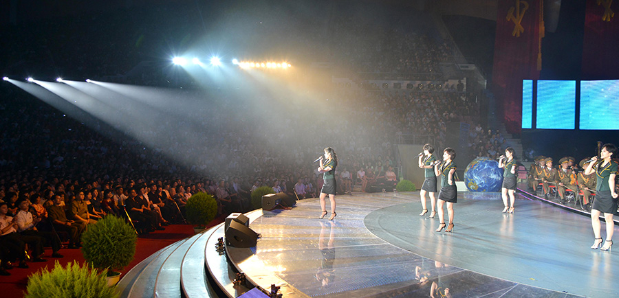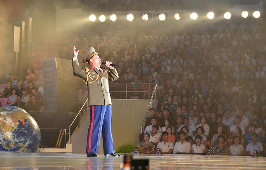Účinkující vysoce chválili znamenité činy drahého váženého vůdce soudruha Kim Čong Una, který posílil KLDR na držitele nejsilnější mezikontinentální balistické rakety, když se oddal dosažení velké věci velkého vůdce soudruha Kim Ir Sena a velkého vůdce soudruha Kim Čong Ila pro budování jaderné síly.