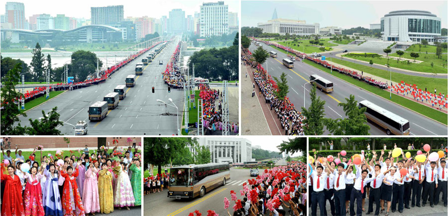 Keď autobusy s tvorcami rakety prechádzali ulicami, občania sa s nimi vrele lúčili, mávali vlajkami KĽDR, červenými zástavami a kyticami pozdĺž cesty na Univerzitnej ulici, moste Okrju, ulici Mansude až po námestie pred krytým štadiónom.