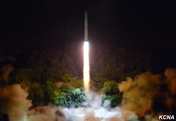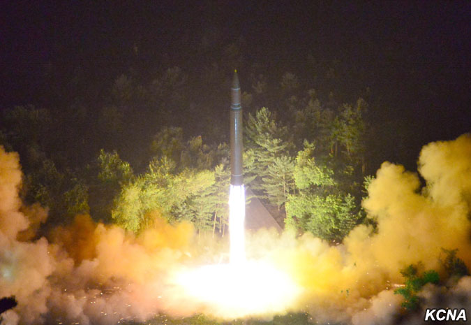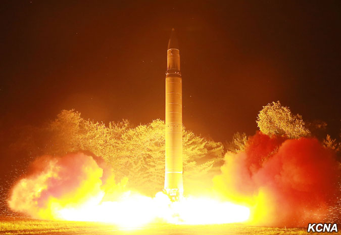 Na příkaz váženého soudruha nejvyššího vůdce mezikontinentální balistická raketa Hwasong-14, nabitá mohutnou silou hrdinné Koreje, vzlétla do vesmíru a zanechala sloup plamenů.