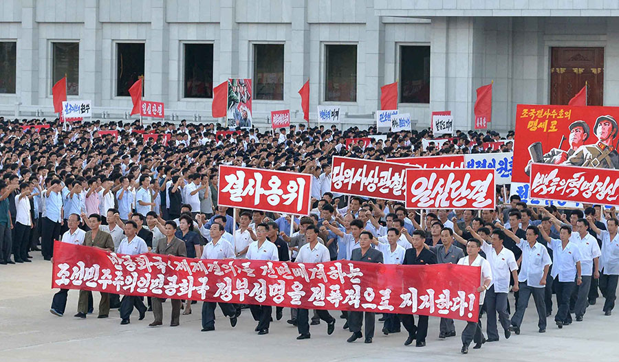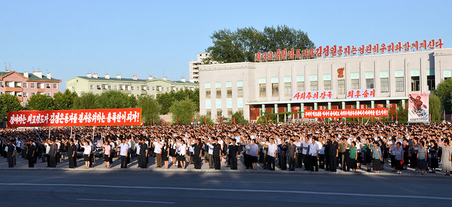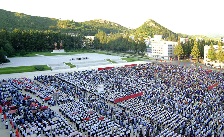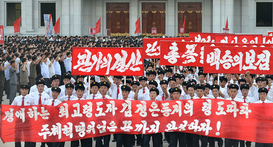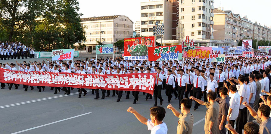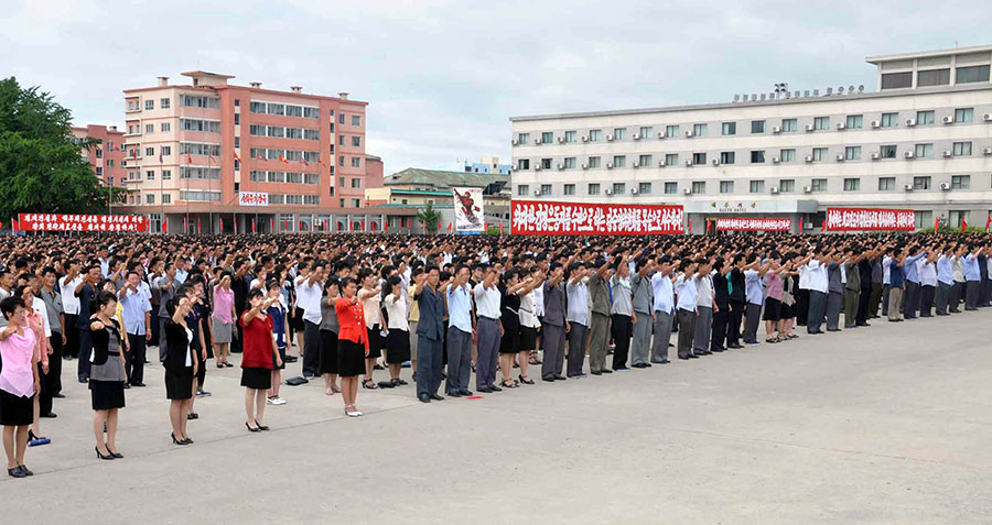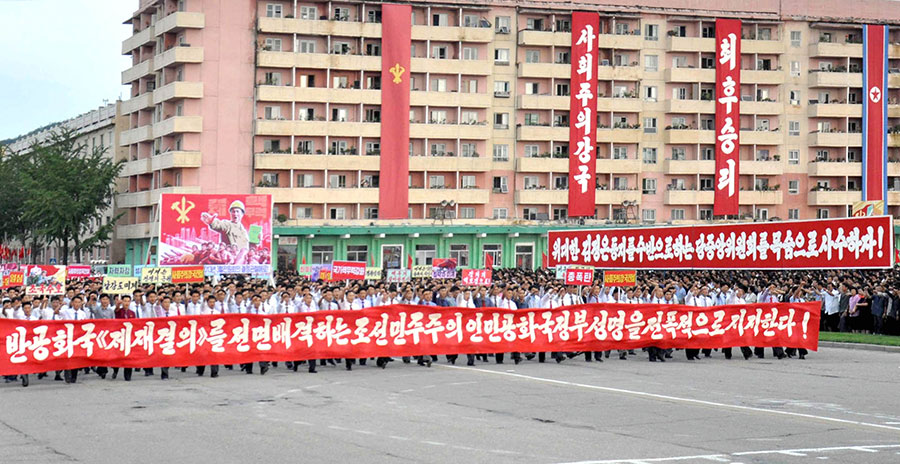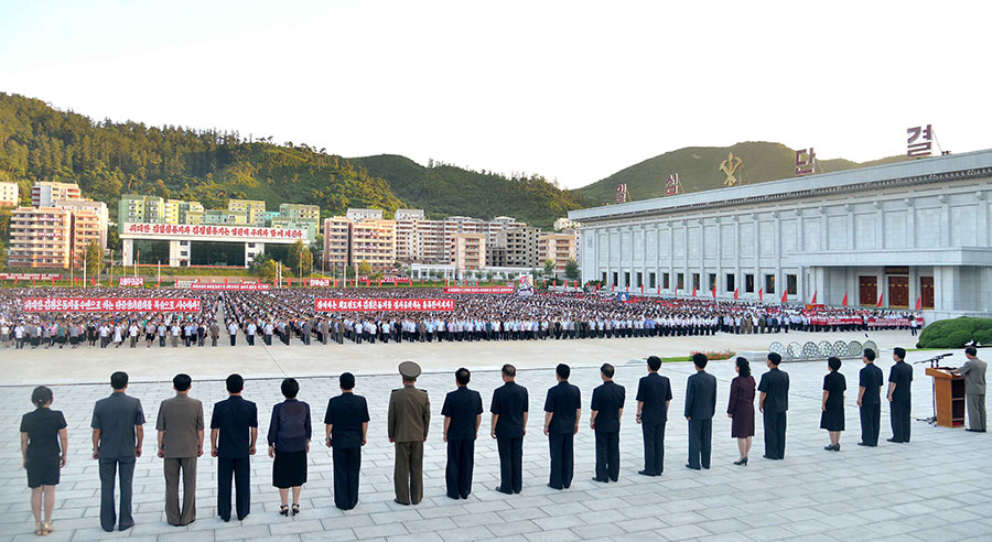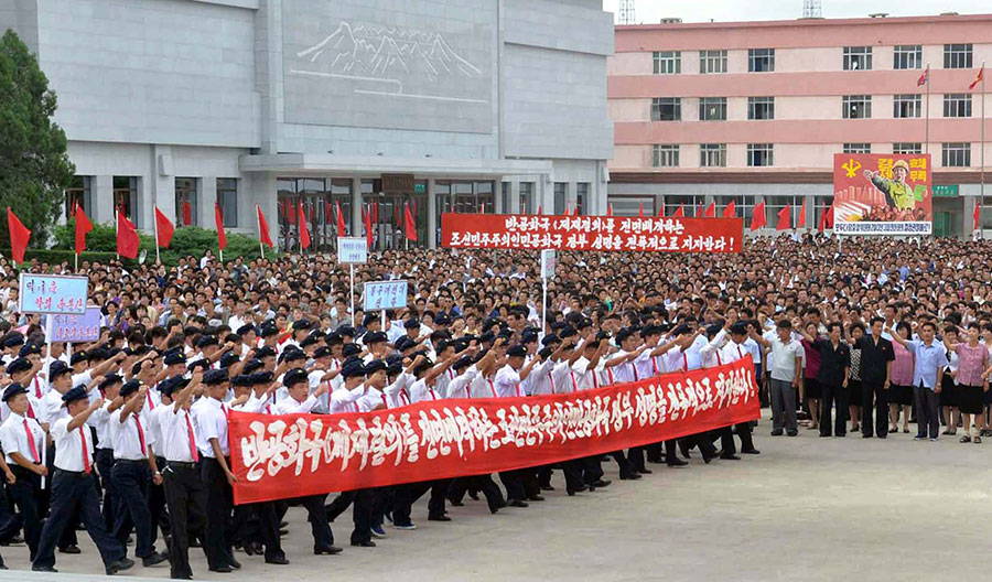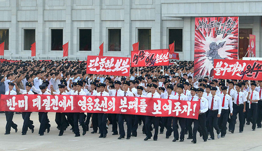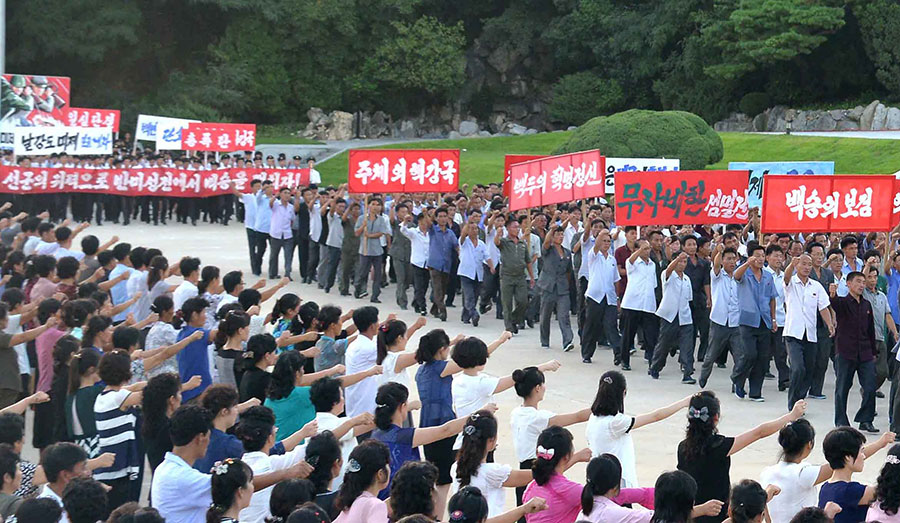 Pchjongjang, 11. srpna čučche 106 (2017) (KCNA) – Shromáždění mládeže, pracujících a odborářů se konala v pátek v Přírodním divadle Parku mládeže a na ploše Památníku založení strany, aby vyjádřili svou naprostou podporu vládnímu prohlášení, které kategoricky odmítlo nedávnou „rezoluci o sankcích“ RB OSN.