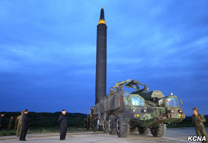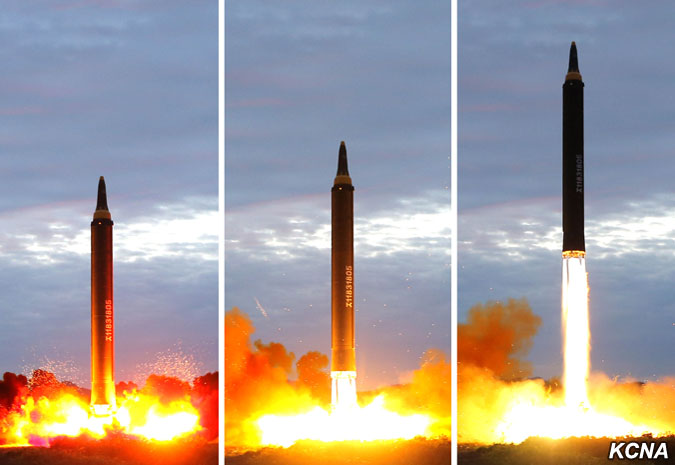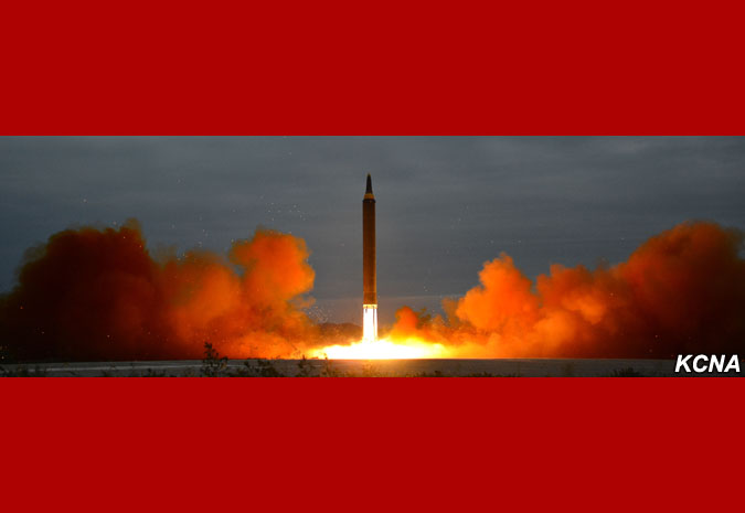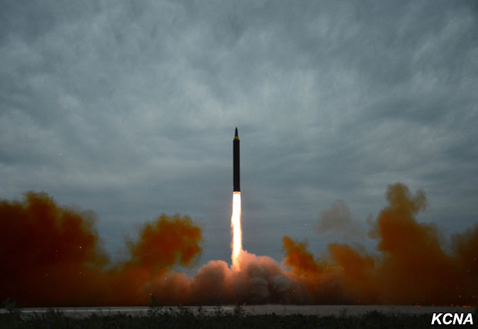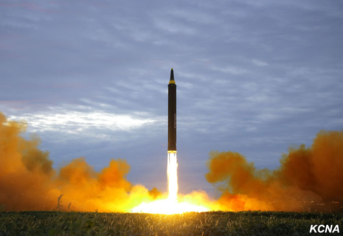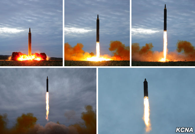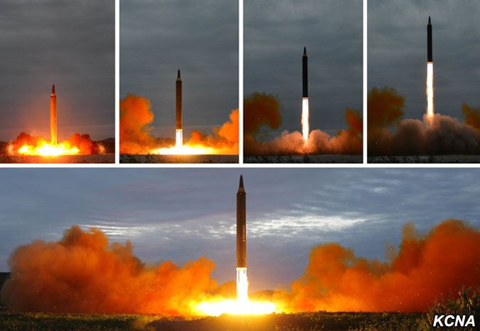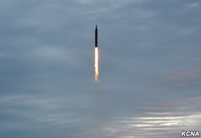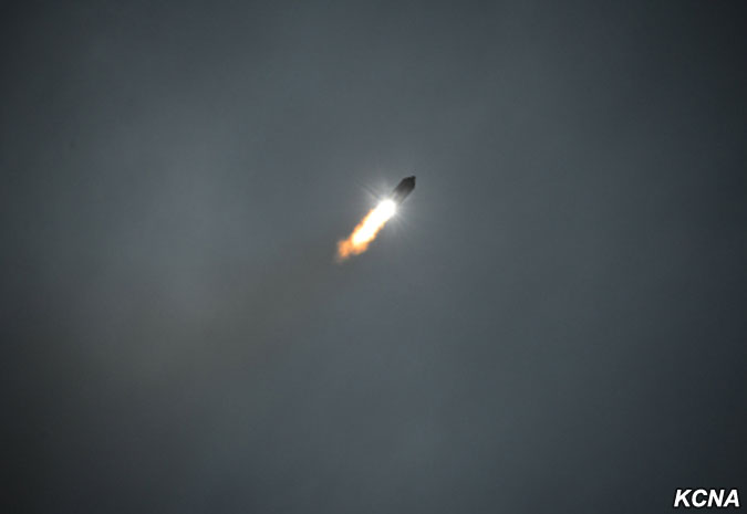Odpálená balistická raketa, která odrážela důstojnost a sílu jaderné mocnosti čučche, překročila nebe nad poloostrovem Ošima (japonského ostrova, pozn. překl.) Hokkaido a japonským mysem Erimo po předem stanovené dráze a přesně zasáhla předem stanovené cílové vody v severním Pacifiku.