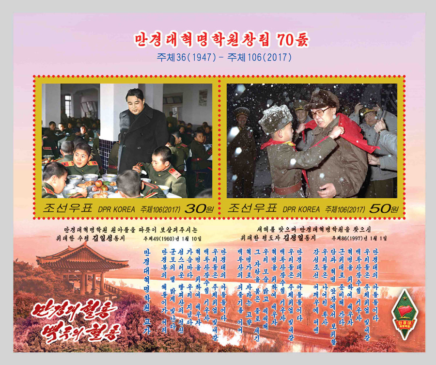 Pchjongjang, 13. října čučche 106 (2017) (KCNA) – Vážený soudruh Kim Čong Un, předseda Korejské strany práce, předseda Komise pro státní záležitosti KLDR a vrchní velitel Korejské lidové armády, poblahopřál Revoluční škole Mangjongde k 70. výročí jejího založení.
