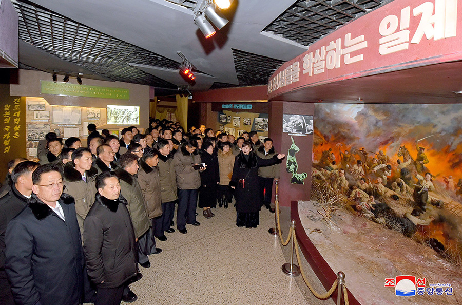 V Muzeu vlastenecké osvobozenecké války si prohlédli různé části spojené se zásluhami velkého vůdce soudruha Kim Ir Sena, projevenými vedením války k vítězství.