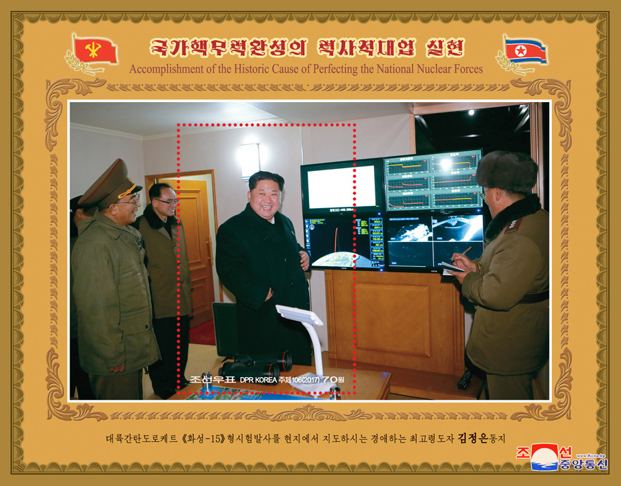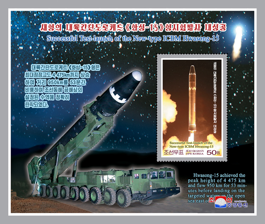 Pchjongjang, 30. prosince čučche 106 (2017) (KCNA) – Státní známkový výbor Korejské lidově demokratické republiky vydal nové známky (čtyři listy a jednu jednotlivou) k připomenutí úspěšné testování střelby nového typu mezikontinentální balistické rakety Hwasong-15.