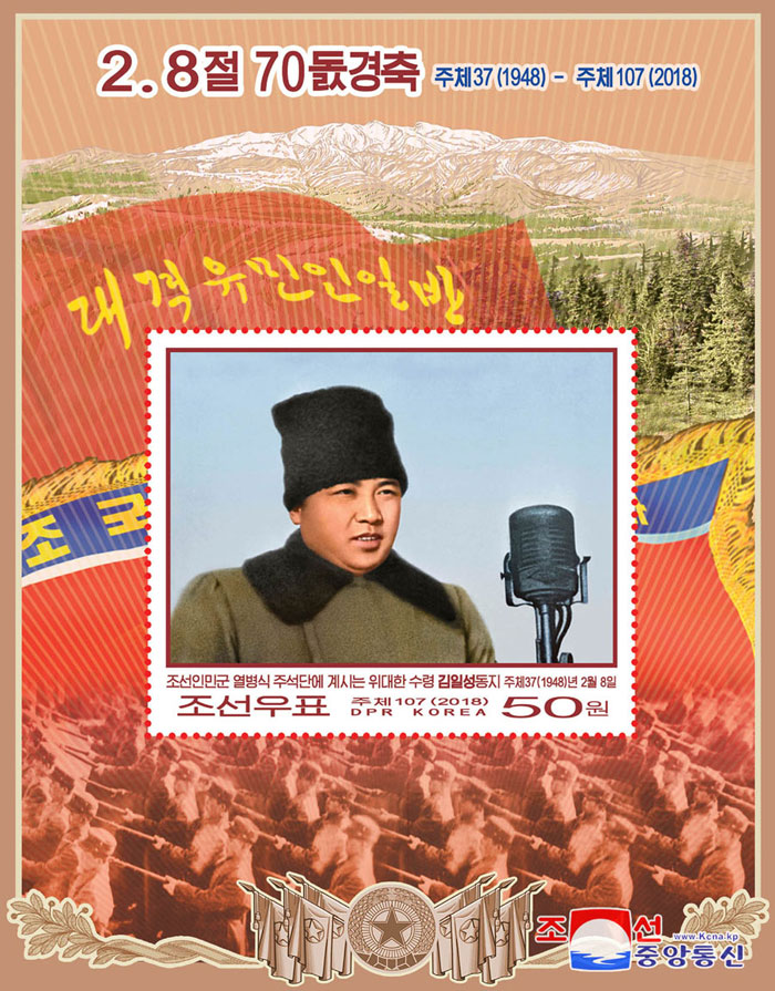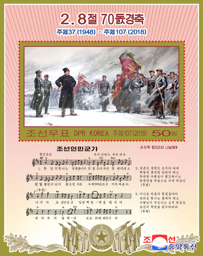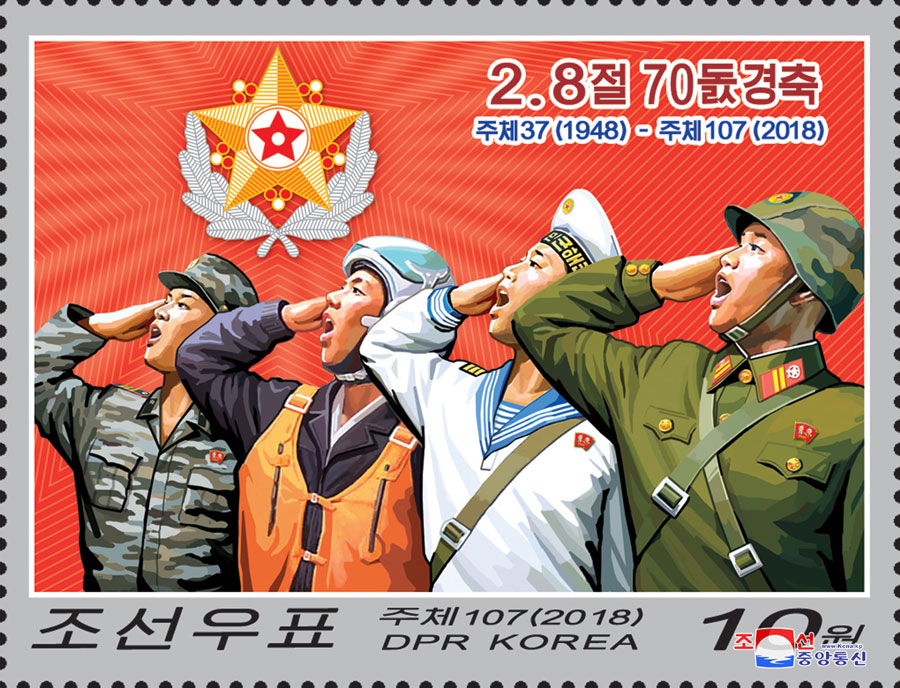 Pchjongjang, 7. února čučche 107 (2018) (KCNA) – Státní známkový výbor KLDR vydal nové známky (dva listy a jednu jednotlivou) k oslavě 70. výročí založení Korejské lidové armády (KLA).