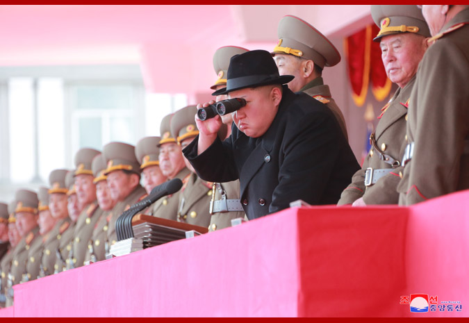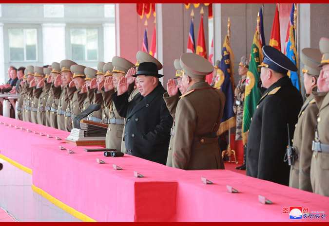 Konala se slavnostní přehlídka stráží tří služeb KLA, aby pozdravila váženého nejvyššího vůdce soudruha Kim Čong Una.