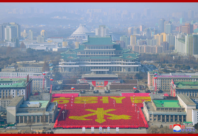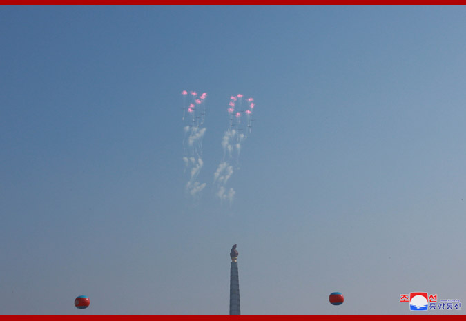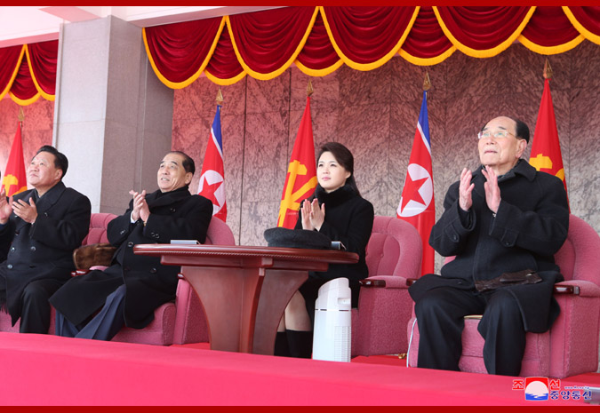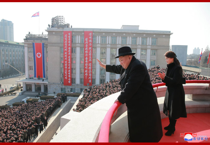 Vážený nejvyšší vůdce soudruh Kim Čong Un, předseda Korejské strany práce, předseda Komise pro státní záležitosti KLDR a vrchní velitel Korejské lidové armády, se dostavil na náměstí společně se soudružkou Ri Sol Ču.