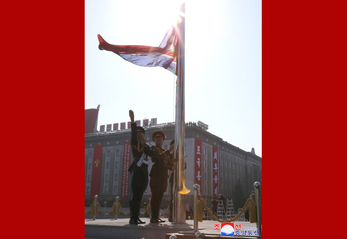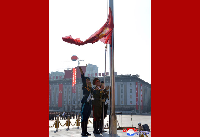 Čestná stráž všech služeb KLA a všichni členové vojenské přehlídky vzdali vysokou čest, vzhlížejíce k vlajkám s portréty velkého vůdce a velkého generála.