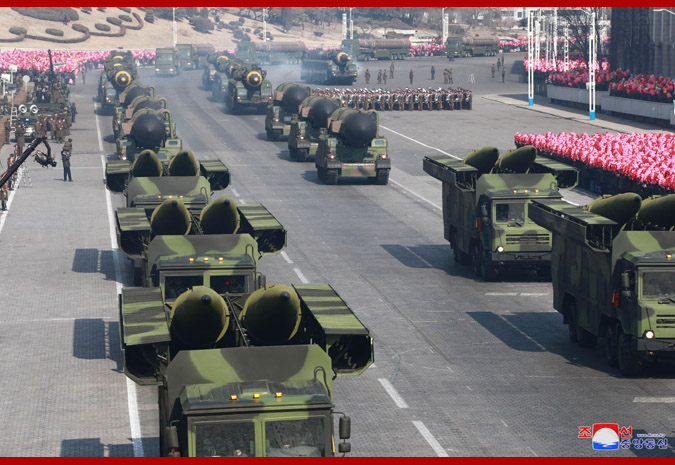Kolony mechanizovaných jednotek, jednotky strategických sil, hwasongští dělostřelci pochodovali náměstím v pěkných útvarech.