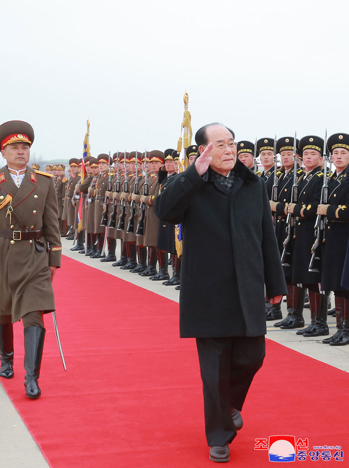 Čestná stráž vojsk Korejské lidové armády nastoupila na parkovišti před letištním terminálem. Soudruh Kim Jong Nam vykonal přehlídku čestné stráže KLA poté, co obdržel pozdrav od svého prvního náměstka.