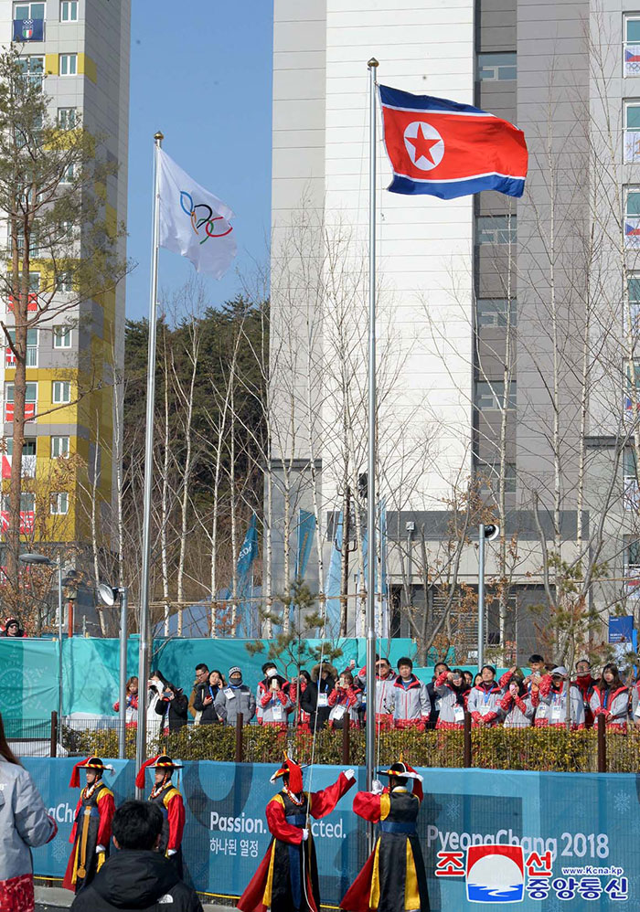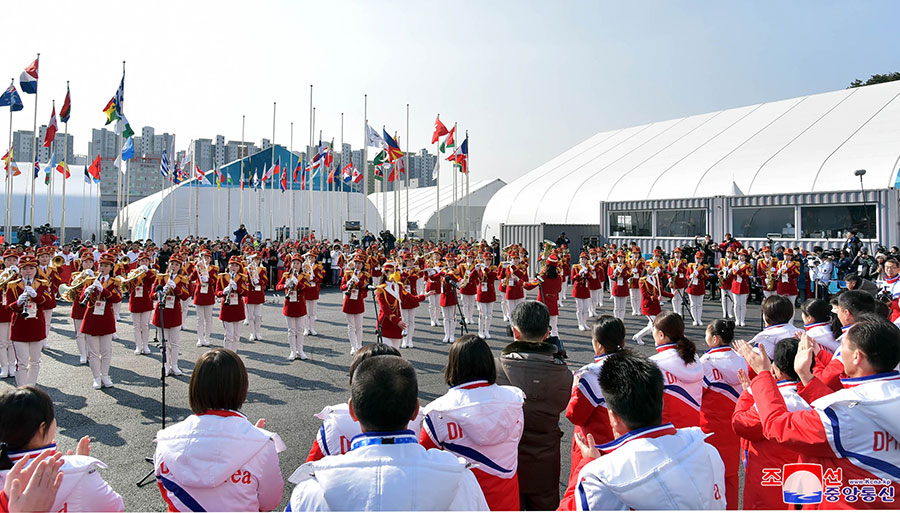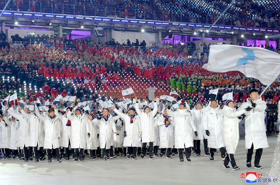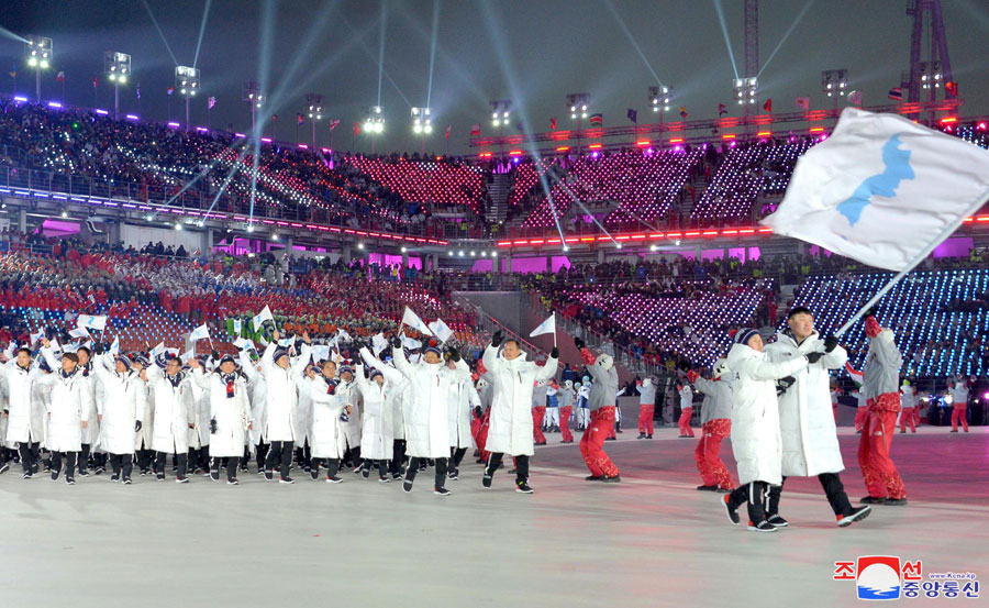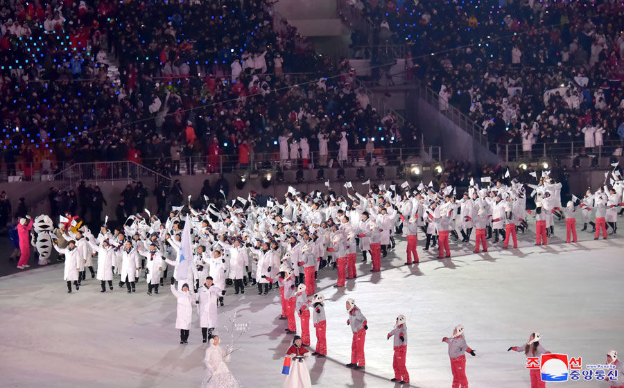 Na stadion vstoupili hráči z celého světa, kteří se zúčastnili 23. zimních olympijských her. Diváci propukli v nadšený potlesk, když hráči severní a jižní Koreje vstoupili na stadion, vedeni vlajkou Korejského poloostrova, uprostřed hraní písně „Arirang“.