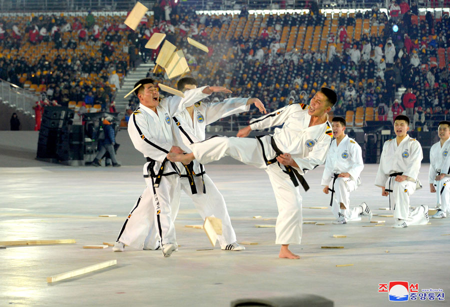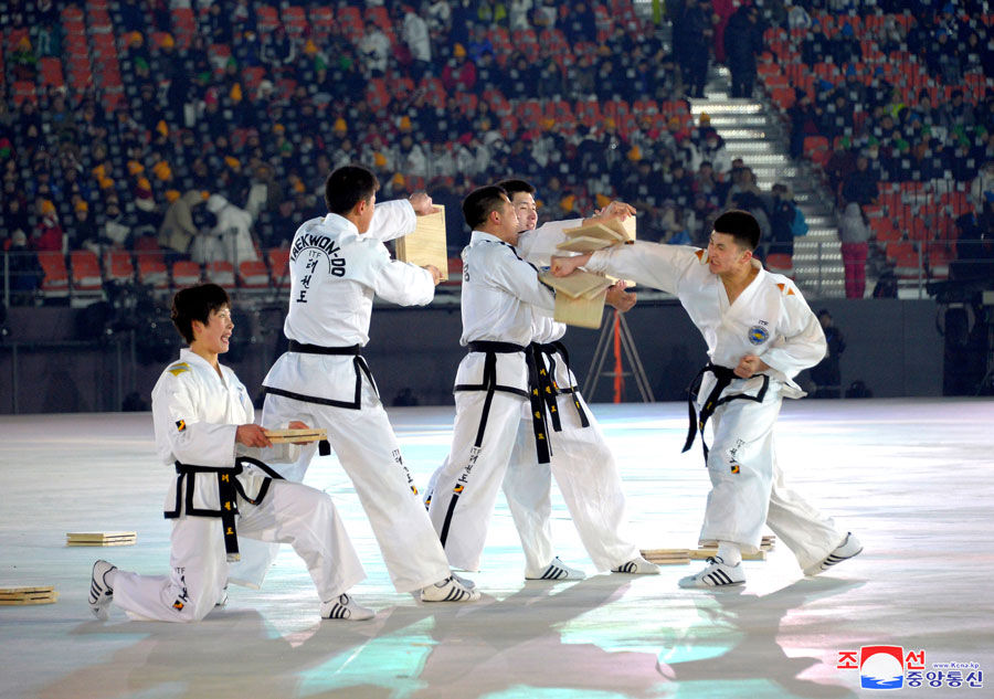 Před obřadem hráči tekwondo (Taekwon-Do) ze severní a jižní Koreje předvedli demonstrační výkon.